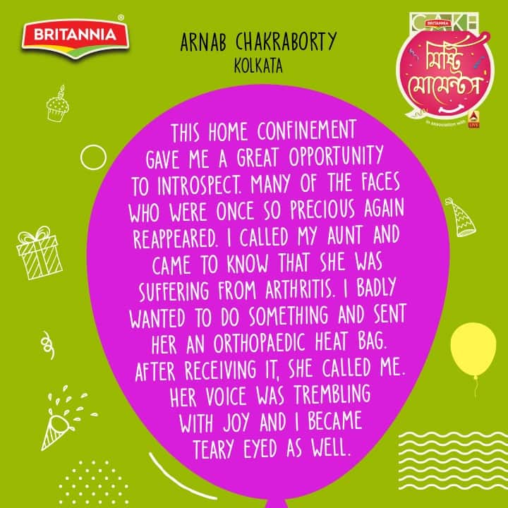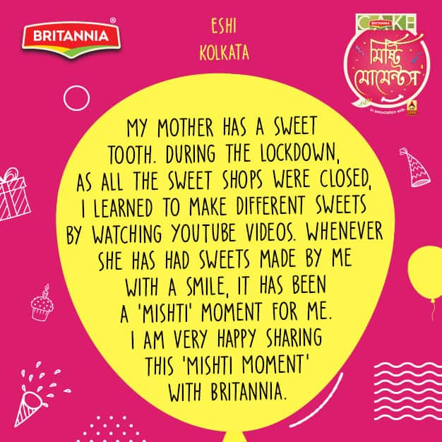 5. How to Participate: To participate in the contest, the participant shall send in their stories through the contest website-https://bengali.abplive.com/britannia-cake-mishti-moments.html or whatsapp number-7044025999 provided therein. The stories should not be more than 100 words and these need to be stories of small joys (these are everyday gestures of kindness, joy, talent and happiness which our loved ones do to make our lives happy. Like a kid helping a grandparent, husband helping his wife in cooking, son helping mom in using smart phones etc)