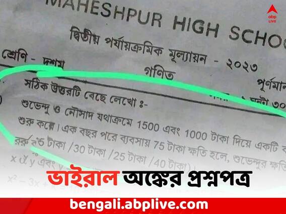 প্রসঙ্গত, রাজ্যের পরীক্ষায় প্রশ্নপত্র ফাঁসের ছবির একগুচ্ছ উদাহরণ রয়েছে। পাশাপাশি রয়েছে নতুন সিলেবাসের বইয়ে আলোচিত বিষয় নিয়ে বিতর্ক। তবে এবার বোধহয় সেই সব থেকেও আর একধাপ এগিয়ে গেল অঙ্কের প্রশ্নপত্র ঘিরে বিতর্ক। কারণ ওই প্রশ্নপত্রে 'শুভেন্দু-নৌশাদের' নাম রয়েছে। যদিও সেখানে পদবি উল্লেখ না করা হলেও, বিতর্ক পিছু ছাড়েনি।