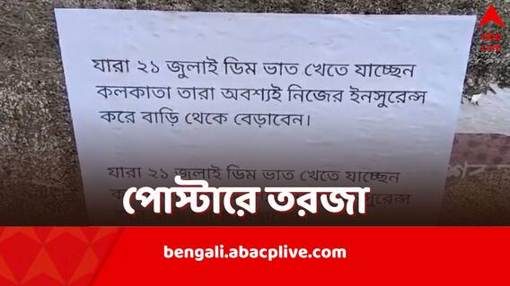 ওই পোস্টারগুলিতে লেখা রয়েছে, 'যাঁরা ২১ জুলাই ডিম-ভাত খেতে কলকাতা যাচ্ছেন, তাঁর অবশ্যই নিজের বিমা করিয়ে বাড়ি থেকে বেরোবেন'। এ নিয়ে শুরু হয়েছে রাজনৈতিক চাপানউতোর। কারণ আগেই তৃণমূলের ২১ জুলাইয়ের সমাবেশে যাওয়া আটকাতে, তাঁদের বাড়ি ঘেরাও করার হুঁশিয়ারি দিয়েছিলেন বিজেপি-র হুগলি সাংগঠনিক জেলার সাধারণ সম্পাদক সুরেশ সাউ।