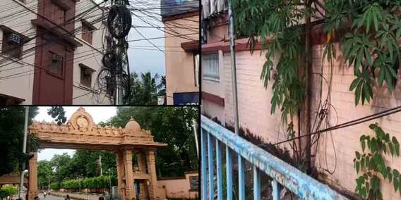 বাতিস্তম্ভ থেকে ঝুলছে গোছা গোছা তার। ঝুলে থাকা তার ছড়িয়ে রয়েছে ফুটপাথের উপরেও। বেলুড় মঠে ঢোকার মুখে ফুটপাথে তারের জঙ্গল কার্যত মরণফাঁদে পরিণত হয়েছে। কিছু বিধিনিষেধ থাকলেও, ইতিমধ্যে ভক্তদের জন্য খুলে দেওয়া হয়েছে বেলুড় মঠ। মঠে ঢোকার মুখে তারের জঙ্গলে সমস্যায় পড়ছেন দর্শনার্থী ও পথচারীরা।