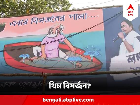 হরিশ চ্যাটার্জি স্ট্রিটে মুখ্যমন্ত্রীর বাড়ির উল্টোদিকের গলিতে লাগানো হোর্ডিংটি । যার ওপরে বড় বড় করে লেখা, এবার বিসর্জনের পালা। হোর্ডিংয়ের বা দিকে দেখানো হয়েছে একটি বিশাল জাহাজ! সেখানে রয়েছে তৃণমূলের প্রতীক। হোর্ডিংয়ের ডানদিকে রয়েছে মমতা বন্দ্যোপাধ্যায় ও অভিষেক বন্দ্যোপাধ্যায়ের ছবি, নিচে লেখা লক্ষ্য ২০২৪।