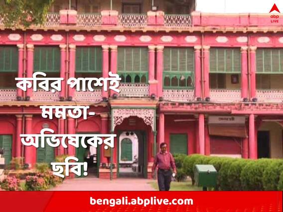 রবীন্দ্রনাথের ছবির সঙ্গেই দেওয়ালে ঝুলছে মমতা-অভিষেকের ছবি