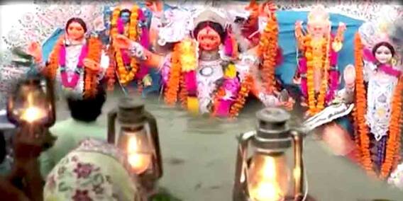 অভিজিৎ চৌধুরী, চাঁচল(মালদা) : উমার বিদায়লগ্নে সম্প্রীতির সুর । দশমীর গোধূলিতে দেবী দুর্গার বিদায়-পর্ব, আর তাতে সামিল হলেন সংখ্যালঘু সম্প্রদায়ের মানুষজন। আলো জ্বালিয়ে বিদায় জানালেন মা-কে। এ ছবি মালদার পাহারপুর মরা মহানন্দার সতীঘাটের। প্রায় সাড়ে তিনশো বছরের পুরনো এই রীতিতে এসেছে সামান্য বদল। আগে লণ্ঠন জ্বালিয়ে সাহুরগাছির বধূরা দাঁড়িয়ে থাকতেন মরা মহানন্দার ওপারে। আর এবার নিরঞ্জনের সময় ওপারের আকবর আলি জ্বালালেন চার্জার লাইট। সম্প্রীতির এই কোলাজেই রব উঠল...আবার এসো মা।