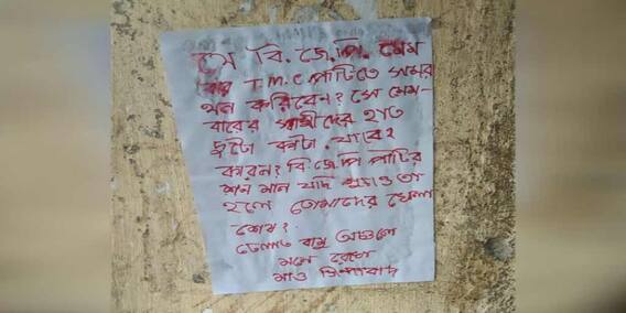 বিজেপির কেউ তৃণমূলকে সমর্থন করলে হাত কেটে নেওয়ার হুমকি। পুরুলিয়ার বরাবাজার ব্লকের ধেলাতবামু গ্রাম পঞ্চায়েতে বৃহস্পতিবার বিজেপির বিরুদ্ধে অনাস্থা আনার পরই মাওবাদীদের নামে পোস্টার ঘিরে চাঞ্চল্য ছড়ায়।