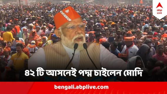 আর এদিন তাঁর থেকে আরও একধাপ এগিয়ে গেলেন নরেন্দ্র মোদি। অমিত শাহ যেখানে ৮৩ শতাংশ আসনে জয়ের লক্ষ্যমাত্রা দিয়েছিলেন, সেখানে মোদি ১০০ শতাংশ আসনই টার্গেট করার নির্দেশ দিলেন। নরেন্দ্র মোদি বলেন, আগামী ৫ বছরে বিজেপি সরকার পুরো দেশে বিনিয়োগ ও কর্মসংস্থানের অগুনতি নতুন সুযোগ তৈরি করতে চলছে। এই সময়টা বাংলার জন্যও অভূতপূর্ব বদলের সময়। কিন্তু তার জন্য আপনাদের শুরুটা এই লোকসভা ভোট থেকেই করতে হবে। করবেন তো? করবেন তো? করবেন তো? বাংলার বিকাশ হবে, তবেই দেশের বিকাশ হবে। তাই এবার ৪২টি আসনের তাই এবার ৪২টি আসনের ৪২টিতেই পদ্ম ফোটাতে হবে। আর দেশে? আব কি বার... ' জনতার তরফে জবাব এল , মোদি সরকার।