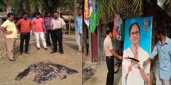 গোপাল চট্টোপাধ্যায়, বোলপুর: বীরভূমের বোলপুরে মুখ্যমন্ত্রী মমতা বন্দ্যোপাধ্যায়ের ছবি দেওয়া তৃণমূলের ফ্লেক্স, ফেস্টুন ছিঁড়ে পুড়িয়ে দেওয়ার অভিযোগ উঠল বিজেপির বিরুদ্ধে। অন্যদিকে, হুগলিতে ডানকুনিতে বিজেপির ব্যানার ছেঁড়ার ঘটনায় নাম জড়াল তৃণমূলের। অভিযোগ অস্বীকার করে একে অপরের বিরুদ্ধে গোষ্ঠীদ্বন্দ্বের তত্ত্ব খাড়া করেছে দু’পক্ষ।