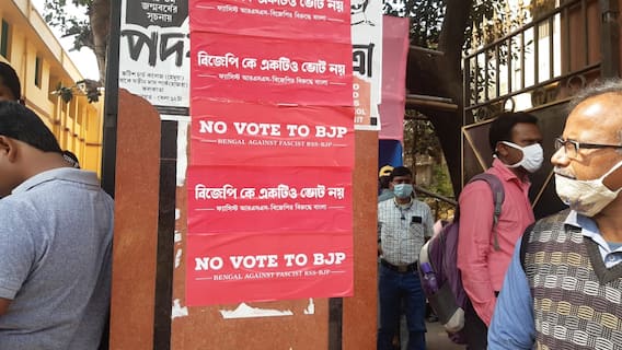 কমলকৃষ্ণ দে, পূর্ব বর্ধমান: ‘বিজেপিকে একটিও ভোট নয়। নো ভোট টু বিজেপি’। বর্ধমান শহরে এমনই পোস্টারে ছয়লাপ। পাশাপাশি পোস্টারে আরও লেখা- ‘ফ্যাসিস্ট আরএসএস-বিজেপির বিরুদ্ধে বাংলা’।লাল রঙের উপর সাদা রঙে ছাপা এই পোস্টারে অবশ্য কোনও সংগঠন বা দলের নাম নেই।
