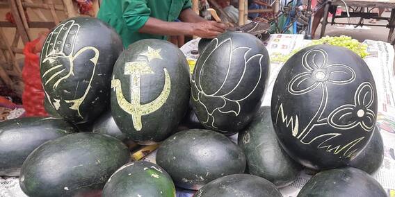 তরমুজ বিক্রেতা মেহের আলির ধারালো চাকুতে তরমুজের গায়ে ফুটে উঠছে ফুল, হাত,কাস্তে। আর সেই তরমুজ কিনতে মেহের আলির দোকানে ভিড় করছেন অনেকেই। মেহেরের কথায় বাজারে আরও অনেকেই তরমুজ বিক্রি করে ৷ তবে এখন তার কাছেই রাজনীতি দলের প্রতীক আঁকা তরমুজ কিনতে ভিড় হচ্ছে। মেহের আলি ছোট থেকেই ধারালো চাকু দিয়ে শোলা কেটে নানান ধরনের মডেল তৈরি করে। আর সেই শিল্পকেই এবার তিনি তুলে ধরেছেন তরমুজের গায়ে। তাঁর নিপুন হাতের ছোঁয়ায় তরমুজ পেয়েছে এক নতুন পরিচয়। মেহের আলি জানান. এখন সব থেকে বেশি জোড়া ফুল আর পদ্মফুলের তরমুজের চাহিদাই বেশি। মাঝে মাঝে দু-একজন হাত ও কাস্তে আঁকা তরমুজেরও খোঁজ করছে। তবে এই তরমুজ কিনে বিপাকে পড়তে হচ্ছে দু-একজন ক্রেতাকে। এক মহিলা জানালেন তিনি না দেখেই তরমুজ কিনে বাড়ি গিয়েছিলেন ৷ কিন্তু বাজারের থলে থেকে তরমুজ বার করতেই ছেলে বাড়িতে হুলুস্থুলু লাগিয়ে দিল ৷ আসলে আমার ছেলে তো তৃণমুল ছাত্র পরিষদ করে। কি আর করব সেই রোদের মধ্যে দোকানে গেয়ে পদ্ম পাল্টে জোড়া ফুল আনতে হল।