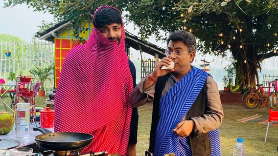 প্রযোজকের শেয়ার করা ছবিতে কেবল রুদ্রনীল নয়, তার পাশে দেখা গেল প্রতীক সেনকেও। তিনিও সেজেছেন গোলাপি শাড়িতে। তাঁর মাথায় ঘোমটাও। তবে ঘোমটার আড়ালে দেখা যাচ্ছে পুরুষালি গোঁফও। তবে তাতে থোড়াই কেয়ার। গ্রাম্য মেয়ের ঢঙে মুখে আঁচল ধরে রেখেছেন তিনি।