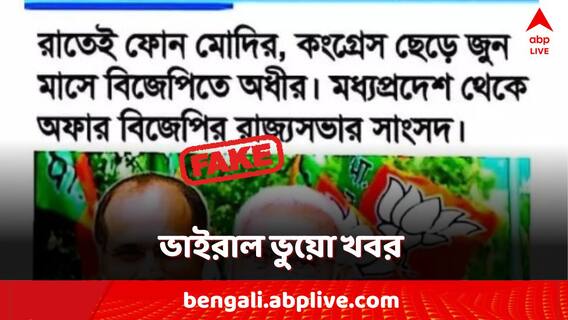কলকাতা: সম্প্রতি সোশ্যাল মিডিয়ায় বর্তমান পত্রিকার (Bartaman Patrika) একটি ভুয়ো প্রতিবেদন ভাইরাল হয়েছে। ভুয়ো প্রতিবেদনটি অনুযায়ী প্রধানমন্ত্রী নরেন্দ্র মোদীর (Narendra Modi) সঙ্গে কথা বলার পর প্রদেশ কংগ্রেস সভাপতি অধীর রঞ্জন চৌধুরী (Adhir Ranjan Chowdhury) জুন মাসে ভারতীয় জাতীয় কংগ্রেস (INC) ছেড়ে বিজেপিতে (BJP) যোগ দেবেন।