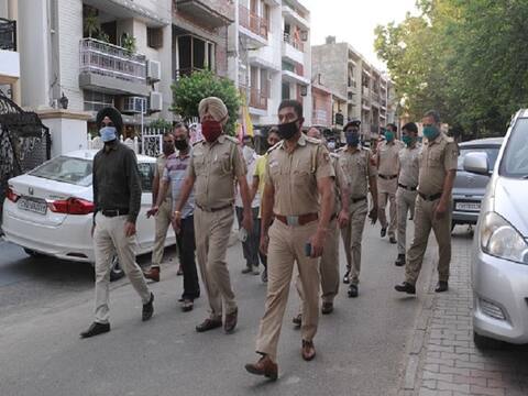 CHANDIGARH, INDIA APRIL 11: Chandigarh police personnel conducts a flag march on the day eighteen of the 21-day nationwide lockdown to curb the spread of coronavirus, at Sector 33, on April 11, 2020 in Chandigarh, India. (Photo by Keshav Singh/Hindustan Times via Getty Images)