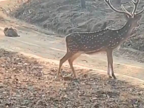 ভিডিওতে একটি হরিণকে এদিক-ওদিক দেখে রাস্তা পার হতে দেখা যাচ্ছে। অন্যদিকে, একটি চিতাবাঘ রাস্তায় গুটিসুটি পাকিয়ে পাথরের মতো ঘাপটি মেরে বসে রয়েছে।