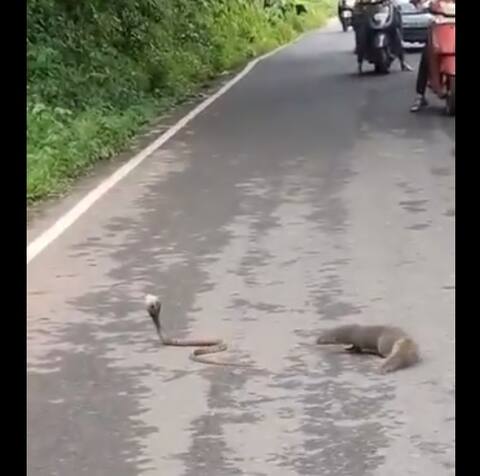নয়াদিল্লি: কথায় বলে অহি-নকুল সম্পর্ক! সাপ ও বেজির জাত শত্রুতার কথা কারুর অজানা নয়। মুখোমুখি হলেই রক্তক্ষয়ী সংঘর্ষ। এমনই একটি ঘটনার ভিডিও সোশ্যাল মিডিয়ায় ভাইরাল হচ্ছে। ভিডিওতে দেখা যাচ্ছে, মাঝরাস্তায় বেজি ও সাপের মধ্য ভয়ানক লড়াই বেঁধে যায়। প্রথমে সাপটি বেজির ওপর আক্রমণ চালায়। পাল্টা জবাব দেয় বেজি। সাপের ওপর তীব্র হামলা শুরু করে। প্রথমে সাপের লেজে আঘাত হানে। পরে সাপের মাথায় আঘাত হানে। সাপটি রণে ভঙ্গ দিতে চেয়েছিল। কিন্তু ছাড়ার পাত্র নয় বেজিটি। পালাতে দেখে বেজিটি সাপটিকে মুখে তুলে নিয়ে রাস্তা থেকে সরে গিয়ে পাশের জঙ্গলে ঢুকে যায় বেজিটি।