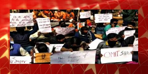 রবিতীর্থে যখন নানা কর্মসূচিতে ব্যস্ত অমিত শাহ, তখন তাঁর সফরের বিরোধিতা শান্তিনিকেতনেই। সোনাঝুরি হাটে চলল প্রতিবাদ। হাতে প্ল্যাকার্ড নিয়ে মুখে কালো কাপড় বেঁধে বিক্ষোভ দেখান রবীন্দ্র অনুরাগীরা।