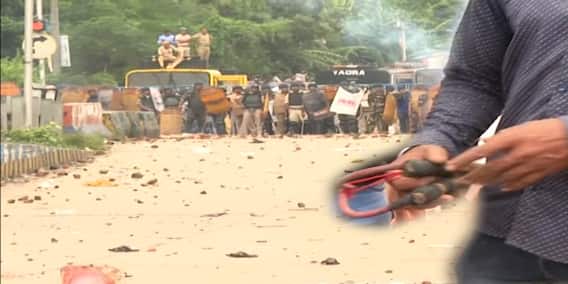 সাঁতরাগাছি: নবান্নে পৌঁছতে না পারলেও, বিজেপি-র অভিযান ঘিরে অগ্নিগর্ভ হাওড়ার সাঁতরাগাছি। জলকামান দেগে, কাদানে গ্যাসের শেল ফাটিয়ে বিক্ষোভকারীদের হটানোর চেষ্টা করে পুলিশ। কিন্তু দফায় দফায় সংঘর্ষে কাতারে কাতারে বিজেপি কর্মীদের সামনে এখন কার্যতই মুষ্টিমেয় পুলিশ। পুলিশকে লক্ষ্য করে মুহুর্মুহু ইট, পাথর উড়ে আসছে। রেলরলাইন থেকে পাথর ছুড়ে জড়ো করে, ঝোলায় পাথর নিয়ে, গুলতিতে বসিয়ে তা পুলিশকে লক্ষ্য করে ছুড়তে দেখা গিয়েছে বিজেপি কর্মী, সমর্থকদের। তাতে বেশ কয়েক জন পুলিশকর্মী রক্তাক্ত এবং আহত হয়েছেন বলে খবর। পাথর থেকে বাঁচতে ঢাল দিয়ে নিজেদের আড়াল করে তফাতে সরে যেতে দেখা যায় পুলিশকে। শুধু তাই নয়, কাছের নির্মীয়মাণ এরকটি বাড়ি থেকেও আধলা ইট এনে পুলিশকে লক্ষ্য করে ছোড়া হয়।