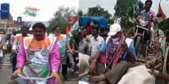 কমলকৃষ্ণ দে, বর্ধমান : পেট্রোপণ্যের মূল্যবৃদ্ধির প্রতিবাদে তৃণমূলের বিক্ষোভ-প্রতিবাদ অব্যাহত। এবার প্রতিবাদ দেখা গেল পূর্ব বর্ধমানে। কোথাও বিধায়ক বাইক গরুর গাড়িতে চাপিয়ে নিজে গরুর গাড়ি চালালেন। আবার কোথাও বিধায়ক বর্ধমান শহরে সাইকেল চালিয়ে মিছিল করে বিক্ষোভ দেখালেন। কোথাও চারচাকায় দড়ি বেঁধে তৃণমূল কর্মীরা দড়ি দিয়ে গাড়ি টেনে বিক্ষোভে শামিল হলেন।