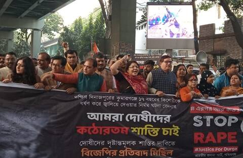 কলকাতা: কুমারগঞ্জে ১৭ বছরের কিশোরীকে ধর্ষণ করে খুনের ঘটনাকে হাতিয়ার করে পথে নামল বিজেপি। আজ সকালে নন্দন থেকে হাজরা পর্যন্ত মিছিলের পরিকল্পনা ছিল বিজেপির। মিছিলের অনুমতি নিয়ে হাইকোর্টে হয় মামলা। আদালতে রাজ্য জানায়, এদিন একই রুটে অপর একটি মিছিল আছে। তাই অনুমতি দেওয়া সম্ভব নয়। রুট বদলের প্রস্তাব দেয় রাজ্য। তাতে সায় দেয় বিজেপি। বেলা তিনটে থেকে নন্দন হয়ে বিড়লা প্ল্যানেটোরিয়াম পর্যন্ত মিছিলের অনুমতি দেয় আদালত। বিজেপির মিছিলের নেতৃত্বে রয়েছেন সাংসদ লকেট চট্টোপাধ্যায়, বিজেপি নেতা রাজু বন্দ্যোপাধ্যায় সহ অগ্নিমিত্রা পাল।