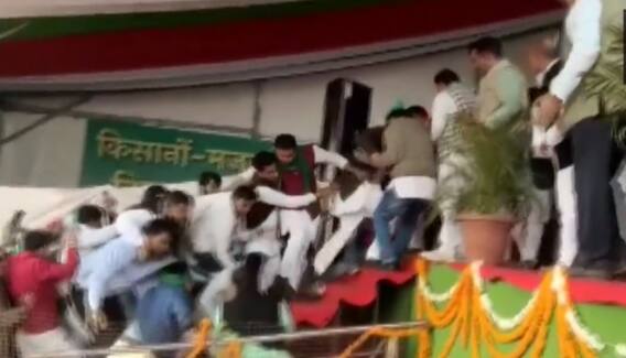 UP Assembly Elections 2022, SP-RLD Joint Rally: উত্তরপ্রদেশের (Uttar Pradesh) আলিগড়ে সমাজবাদী পার্টি (এসপি) ও রাষ্ট্রীয় লোকদল (আরএলডি)-র যৌথ জনসভা ছিল আজ। আগামী বছরেই উত্তরপ্রদেশে বিধানসভা নির্বাচন। ইতিমধ্যেই প্রচারে ঝড় তোলার চেষ্টা করছে প্রতিদ্বন্দ্বী রাজনৈতিক দলগুলি। প্রচারে নেমে পড়েছেন প্রাক্তন মুখ্যমন্ত্রী তথা এসপি (SP) নেতা অখিলেশ যাদব। এবার জোট বেঁধে লড়াইয়ের ঘোষণা করেছে এসপি ও আরএলডি। এরইমধ্যে আজ ছিল আলিগড়ে এসপি-আরএলডি-র (RLD) যৌথ সমাবেশ। এই সমাবেশের মঞ্চে ওঠার পথে সিঁড়ির রেলিং আচমকাই ভেঙে পড়ল। ঘটনার সময় মঞ্চে ছিলেন আরএলডি-র সভাপতি জয়ন্ত চৌধুরী। যদিও এর ফলে কারুর গুরুতরভাবে জখম হওয়ার খবর নেই।