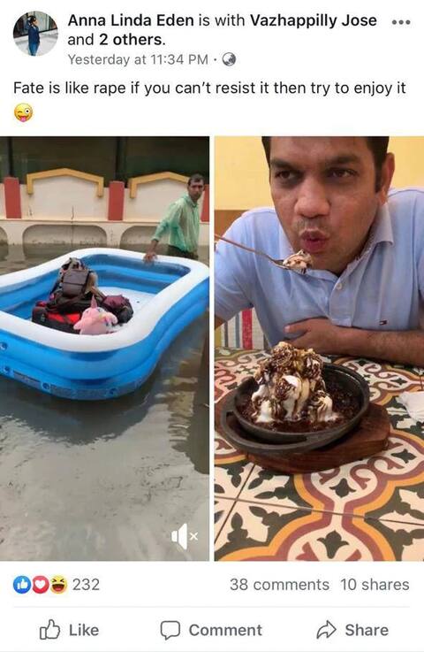 নয়াদিল্লি: কেরলের কংগ্রেস সাংসদ হিবী ইডেনের স্ত্রীর বিতর্কিত পোস্ট ঘিরে এখন তোলপাড় রাজনৈতিক মহল। কেরলের বিস্তৃত এলাকা যখন জলের তলায়, ঠিক তখনই সাংসদ-পত্নীর এই লেখা নিয়ে প্রায় ঝড় উঠল। বন্যাদুর্গত কেরলের একটি দৃশ্য ও তার সঙ্গে তাঁর স্বামীর আইসক্রিমে মজে থাকা একটি ছবি পোস্ট করেন তিনি। সেই সঙ্গে ক্যাপশনে তিনি লেখেন, ‘ভাগ্য ঠিক ধর্ষণের মতো, আটকাতে না পারলে মজা লুটুন।’ – সাংসদ পত্নীর এই ট্যুইট দেখে সমালোচনার ঝড় ওঠে। ধর্ষণের মতো একটি ঘৃণ্য ও মর্মান্তিক বিষয় নিয়ে এরকম মন্তব্য করায় কটাক্ষ করেন নেটিজেনরা। কমেন্ট বক্সে একজন লেখেন, ‘একদিকে যখন মানুষ ধর্ষণের বিরুদ্ধে লড়াই করছে, ঠিক তখন কিছু মহিলা তা নিয়ে মজা করছে।’ নিন্দার মুখে পড়ে পোস্টটি মুছে ফেলেন তিনি। পরে ক্ষমাও চেয়ে নেন। লেখেন, ‘আমার পোস্টটি একেবারেই ব্যক্তিগত মত। কাউকে আঘাত করার উদ্দেশ্যে লেখা নয়। তবু কারও যদি খারাপ লেগে থাকে, তার জন্য আমি ক্ষমাপ্রার্থী।’ পোস্টটিতে তাঁর স্বামীর ছবির সঙ্গে যে ভিডিওটি শেয়ার করেছিলেন সাংসদ পত্নী, সেখানে দেখা যাচ্ছিল, এক বন্যাদুর্গত মানুষ একটি বেবি বাথটাবে করে বাড়ির জিনিসপত্র নিয়ে চলেছে।