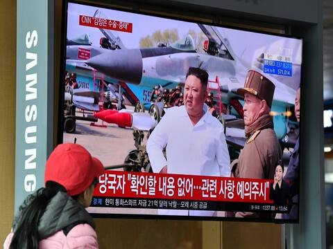 A woman watches a television news broadcast showing file footage of North Korean leader Kim Jong Un, at a railway station in Seoul on April 21, 2020. - South Korea played down a report on April 21 that the North's leader Kim Jong Un was being treated after surgery, as speculation mounted over his absence from a key anniversary. (Photo by Jung Yeon-je / AFP)