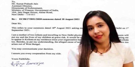 এনফোর্সমেন্ট ডিরেক্টরেটকে লেখা চিঠিতে তৃণমূল কংগ্রেস সাংসদ অভিষেক বন্দ্যোপাধ্যায়ের স্ত্রী রুজিরা বলেন, ‘বাড়িতে ২টি সন্তান রয়েছে। করোনা পরিস্থিতিতে দিল্লি যাওয়া ঝুঁকিপূর্ণ। তাই কলকাতার বাড়িতে এসে জিজ্ঞাসাবাদ করা হোক।’