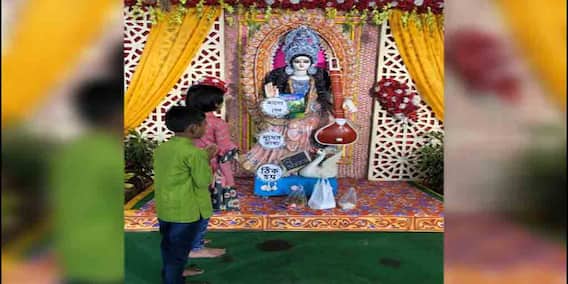 এই বিষয়টাকে উল্লেখ করেই উল্টোডাঙ্গার একটি সরস্বতী পুজোয় দেখা গেল অভিনব ছবি। বিধান শিশু উদ্যানে নিয়মিত শ-পাঁচেক কচিকাঁচা খেলাধুলো করতে আসে। ছেচল্লিশ বছর ধরে সরস্বতী পুজো হচ্ছে বিধান শিশু উদ্যানে। এবারে তারা নিয়ে এসেছে অভিনব ভাবনা যাতে রয়েছে রাজনৈতিক নেতাদের উদ্দেশ্যে কটাক্ষ।
