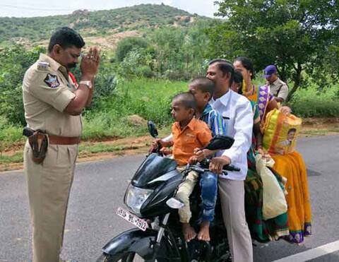 অনন্তপুর: নেট দুনিয়ায় আচমকা জনপ্রিয়তা পেয়েছেন অন্ধ্রের সার্কেল ইন্সপেক্টর বি শুভ কুমার। মোটর বাইকের ফুয়েল ট্যাঙ্কে ২ ছেলেকে বসিয়ে নিয়ে চলা এক ব্যক্তিকে হাতজোড় করে আইন মানতে অনুরোধ করেছেন তিনি। তাঁর ওই ছবি সোশ্যাল মিডিয়ায় ভাইরাল হয়ে গিয়েছে। অন্ধ্রের অনন্তপুর জেলায় তোলা হয়েছে এই ছবি। পোস্ট করেছেন কর্নাটক ক্যাডারের আইপিএস অফিসার অভিষেক গোয়েল। তাঁর টুইট ৩০০০ বার রিটুইট হয়েছে, ৫০০০-এর বেশি লাইক পড়েছে। সার্কল ইন্সপেক্টর বি শুভ কুমার পথ সচেতনতার ওপর দেড় ঘণ্টার একটি অনুষ্ঠান শেষে কাজে যোগ দিতে যাচ্ছিলেন। সে সময় তিনি বাইকে করে আসতে দেখেন এক ব্যক্তিকে। বাইকে ছিলেন আরও ৪ জন। ভদ্রলোকের ২ ছেলে বসেছিল ফুয়েল ট্যাঙ্কের ওপর, স্ত্রী ও এক আত্মীয় পিছনে। কারও মাথায় হেলমেট ছিল না।
