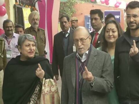 গ্রেটার কৈলাসের একটি বুথে ভোট দিতে যান উপ রাজ্যপাল অনিল বৈজল ও তাঁর স্ত্রী মালা বৈজল। ছবি সৌজন্যে এএনআই
