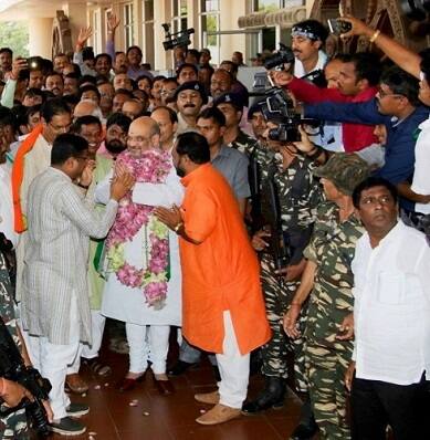 ২১ ও ১৪৭টি পদ্মের মালা পরিয়ে ওডিশায় অমিত শাহকে স্বাগত বিজেপি কর্মীদের