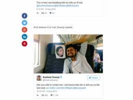 টুইটারে এক সদ্যবিবাহিত দম্পতি টুইট করেছিলেন মধুচন্দ্রিমায় যাওয়ার দুদিন আগে তাঁর কাজাকবাসী স্ত্রী পাসপোর্ট হারিয়ে ফেলেছেন। অগত্যা বাধ্য হয়ে স্বামীকে একাই ইতালি চলে যেতে হয়। কিন্তু টুইটারে ম্যাঙ্গালোরবাসী ফটোগ্রাফার ফৈজান পটেল-এর টুইট দেখে মন নরম হয়ে যায় বিদেশমন্ত্রীর। তিনি নিজে দায়িত্ব নিয়ে টুইট করে ফৈজানকে বলেন, তোমার স্ত্রীকে আমার সঙ্গে যোগাযোগ করতে বল। পাসপোর্টের আরেকটি কপির ব্যবস্থা এক্ষুনি হয়ে যাবে। পরবর্তী বিমান ধরেই তোমার স্ত্রী ইতালি পৌঁছে যাবেন।