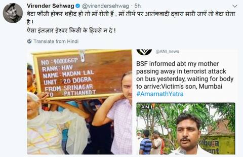https://twitter.com/virendersehwag/status/884671290182729728 টুইটের সঙ্গে দুটি ছবিও পোস্ট করেন সহবাগ। একটি ছবিতে দেখা যাচ্ছে, এক শহিদের দেহ নিয়ে যাচ্ছেন তাঁর মা। অন্য ছবিতে, সদ্য অমরনাথ যাত্রায় নিহত এক মহিলার দেহ নিয়ে যাচ্ছেন তাঁর ছেলে। তিনি আরও লেখেন, নিহতদের পরিবারকে গভীর সমবেদনা। তীর্থযাত্রীদের হত্যা করার জন্য অন্য পর্যায়ের ঘৃণ্যতা লাগে। https://twitter.com/virendersehwag/status/884446696431788032শুধু সহবাগই নন, গতকালের হামলায় টুইটারে শোকপ্রকাশ করেছেন আরেক ক্রিকেটার হরভজন সিংহও। তিনি লেখেন, ফের নীরিহ প্রাণ ঝড়ে পড়ল। এধরনের কাপুরুষোচিত হামলা বন্ধ হওয়া উচিত। ক্ষতিগ্রস্তদের পরিবারকে সমবেদনা।