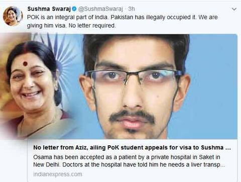 ২৪ বছর বয়সি পাক অধিকৃত কাশ্মীরের ওই ব্যক্তি যকৃতে টিউমারে আক্রান্ত। নয়াদিল্লিতে এসে তিনি চিকিত্সা করাতে চান। তাই জন্যে তাঁর মেডিক্যাল ভিসার প্রয়োজন ছিল, এবং তিনি সেই ভিসা খুব তাড়াতাড়ি পেয়েও যাবেন, দাবি সুষমার।