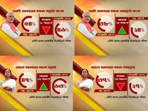 কলকাতা: জনমত সমীক্ষা বলছে পশ্চিমবঙ্গে তৃণমূলের জনপ্রিয়তা যখন উর্ধ্বমুখী, তখন বিজেপির গ্রাফ নামার ইঙ্গিত। আর এরইসঙ্গে এবিপি আনন্দ-লোকনীতি-সিএসডিএসের সমীক্ষায় এ-ও উঠে এসেছে, কেন্দ্রে ক্ষমতাসীন মোদী সরকারের কাজ নিয়েও অসন্তোষের পারদ ক্রমেই চড়ছে বাংলায়। ২০১৭ সালের মে মাসের সমীক্ষায় মোদী সরকারের পারফরম্যান্সে সন্তুষ্ট ছিলেন, বাংলার ৫৪ শতাংশ মানুষ। আর এই জানুয়ারিতে সেটা কমে হয়েছে ৪৬%। অর্থাত আট মাসে, মোহভঙ্গ হয়েছে ৮ শতাংশ বঙ্গবাসীর! ২০১৭ সালের মে মাসে মোদী সরকারের পারফরম্যান্সে সন্তুষ্ট নন, এমনটা বলেছিলেন এ রাজ্যের ২৪ শতাংশ বাসিন্দা। আর এখন অসন্তুষ্টের পরিমাণ বেড়ে হয়েছে ৩৮ শতাংশ! যদিও, সমীক্ষায় স্পষ্ট ইঙ্গিত, সাত বছর ক্ষমতায় থাকার পরও মমতা বন্দ্যোপাধ্যায়ের সরকারের উপর আস্থা বাড়ছে বাংলার মানুষের। ২০১৭ সালের মে মাসে মমতা সরকারের পারফরম্যান্সে সন্তুষ্ট বলেছিলেন, ৪৭ শতাংশ। এখন সেটা বেড়ে হয়েছে ৬৩ শতাংশ! গত বার তৃণমূল সরকারের কাজে সন্তুষ্ট নয় বলেছিলেন ৩৭ শতাংশ মানুষ। সেটা এবার কমে হয়েছে ২৭ শতাংশ। অর্থাত, সন্তুষ্টি বেড়েছে বেড়েছে ১৬ শতাংশের! অসন্তুষ্টি কমেছে ১০ শতাংশের! অনেকেরই প্রশ্ন, তাহলে কি কন্যাশ্রীর ২৫ হাজার টাকা, ২ টাকা কেজি দরে চাল, স্কুলপড়ুয়াদের সাইকেল, জুতো প্রদানের মতো জনকল্যাণমূলক নানা প্রকল্পের ডিভিডেন্ট পাচ্ছেন মমতা? এই মুহূর্তে লোকসভা নির্বাচন হলে, কাকে আপনারা প্রধানমন্ত্রী হিসেবে দেখতে চান? এই প্রশ্নের উত্তরেও পশ্চিমবঙ্গে নরেন্দ্র মোদীকে টেক্কা দিয়েছেন মমতা বন্দ্যোপাধ্যায়! ২০১৭ সালের মে মাসে এ রাজ্যের ৪২ শতাংশ মানুষ বলেছিলেন প্রধানমন্ত্রী পদে তাঁদের পছন্দ মোদী। এই জানুয়ারিতে সেই পছন্দ নেমে এসেছে একেবারে ২৬ শতাংশে! অন্যদিকে, ক্রমেই ঊর্ধ্বমূখী বাংলার মুখ্যমন্ত্রীর জনসমর্থন। গত মে মাসে বাংলার তেরো শতাংশ মানুষ বলেছিলেন প্রধানমন্ত্রী পদে তাঁদের পছন্দের প্রার্থী মমতা। আর এখন করা সমীক্ষা অনুযায়ী, ২০১৮ সালের জানুয়ারিতে রাজ্যের ২৯ শতাংশ মানুষ বলছেন, প্রধানমন্ত্রী পদে তাঁদের পছন্দ তৃণমূলনেত্রী। অর্থাৎ, প্রধানমন্ত্রী পদে মোদী নন, সংখ্যাধিক্য বঙ্গবাসীর পছন্দ মমতা। যদিও এসব সমীক্ষার পূর্বাভাস মাত্র। আসল উত্তর মিলবে ভোট হলে।