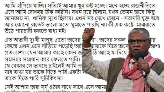 রাজনীতিতে হাতেখড়ি কয়েকমাস। কিন্তু এরমধ্যেই নাকি হাঁপিয়ে উঠেছেন বলাগড়ের তৃণমূল বিধায়ক মনোরঞ্জন ব্যাপারী! ফেসবুকে তাঁর ওয়ালে পোস্ট করা হয়েছে এমনই কয়েকটি কথা। তবে কী তৃণমূলে বেসুরো মনোরঞ্জন? তিনি অবশ্য এমনটা মানতে নারাজ। তাঁর দাবি, রাজনীতিতে আসার পর, গুরু দায়িত্ব পালন করতে গিয়ে, তিনি হাঁপিয়ে উঠেছেন।