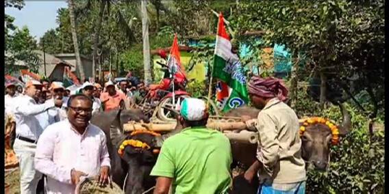 মহিষের গাড়ির ওপরে বাইক তুলে, গ্যাস সিলিন্ডার নিয়ে এভাবেই বাড়ি বাড়ি প্রচার সারল তৃণমূল। যদিও শাসকদলের এই প্রচার অভিযানকে আমল দিতে নারাজ গেরুয়া শিবির।