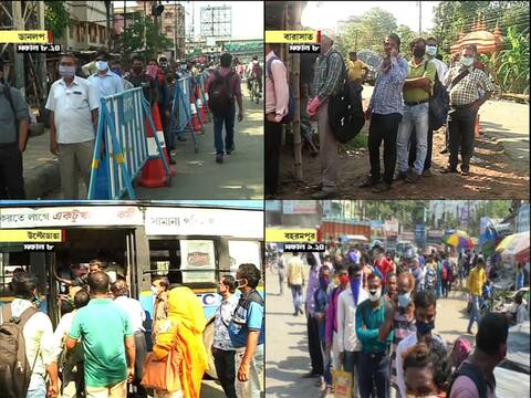 কলকাতা: চতুর্থ লকডাউনের পর আনলকের প্রথম পর্যায়ে প্রবেশ করেছে দেশ। রাজ্যে চালু হয়েছে সরকারি -বেসরকারি বাস। সরকার ৮ জুন থেকে অফিসে হাজিরা সংক্রান্ত নতুন নির্দেশ জারি করার কথা বললেও, ১ জুন থেকেই রাস্তায় রাস্তায় অফিসযাত্রীদের ভিড় চোখে পড়ল। সেই সঙ্গে ভয়ঙ্কর ভাবে ধরা দিন করোনা-সতর্কতার তোয়াক্কা না করে সোশ্যাল ডিসট্যান্সিং উপেক্ষা করে মানুষের জটলার ছবি। হয়ত নিরুপায় হয়েই। বাস চলছে। কিন্তু করোনা-বিধি মেনেই বাসে দাঁড়িয়ে যাওয়া যাবে না। অন্যদিকে বেসরকারি বাস রাস্তায় নেমেছে নামমাত্র। সরকারি বাসও অপ্রতুল। এই পরিস্থিতিতে ঘণ্টার পর ঘণ্টা অপেক্ষা করেও মিলছে না বাস। কখনও স্ট্যান্ড থেকে সিট ভর্তি করে হু হু করে ছুটে যাচ্ছে বাস। মাঝপথে অপেক্ষারত যাত্রীরা পড়ে থাকছেন বিশ বাঁও দলে। শহর-শহরতলি ও জেলার কিছু কিছু জায়গায়, আনলক ওয়ানেই চিত্রটা এরকমই। যদিও সব থেকে ভয়াবহ অবস্থা শহরেই। এক ঝলকে দেখে নেব, কোথায় কেমন পরিস্থিতি। উল্টোডাঙা মোড়ে আনলক ওয়ানের দ্বিতীয় দিন সকালে নিত্যযাত্রীদের হয়রানির ছবি প্রকট। দীর্ঘক্ষণ বাসের দেখা নেই। অফিসযাত্রীদের ভিড়ে দূরত্ব-বিধি মানাও সম্ভব হচ্ছে না। এই পরিস্থিতিতে সামাজিক দূরত্ব মানা সম্ভবও নয়, মানছেন যাত্রীরাই। দক্ষিণ ২৪ পরগনার কামালগাজি বাস স্ট্যান্ডে ঘণ্টার পর ঘণ্টা বাসের অপেক্ষায় দাঁড়িয়ে যাত্রীরা। ২-৩ ঘণ্টা দাঁড়িয়েও মিলছে না গন্তব্যে পৌঁছানোর যান। 'কোনওমতে যদি পৌঁছেও যাই, ফিরব কী করে বাড়ি?', আতঙ্কের ছাপ নিত্যযাত্রীদের মুখে। অনেকদিন পর আবার ডানলপ মোড়ে মানুষের ভিড়। কিন্তু বহু ক্ষণ পর দেখা মিলছে এক-একটি বাসের। বাস স্ট্যান্ডের সামনে দীর্ঘ লাইন। বাস এলেও, যাত্রী তোলার জায়গা নেই। কপালে ভাঁজ যাত্রীদের। সময়ে অফিস পৌঁছানোর আশা ছেড়ে দিয়েছেন অনেকেই। আনলকের পয়লা দিনেই এয়ারপোর্ট এলাকায় ধরা পড়েছিল যাত্রী হয়রানির ছবিব। দ্বিতীয় দিনেও ব্যতিক্রম হল না। এরপর বাড়তি অশান্তি ট্রাফিক জ্যাম। আড়াই নম্বর গেটের কাছে বেলঘরিয়া এক্সপ্রেসওয়ে এবং যশোর রোডের সংযোগস্থলে ব্যাপক যানজট দেখা গেল। এয়ারপোর্ট এক নম্বর গেটের কাছে বাসের অপেক্ষায় যাত্রীদের সুদীর্ঘ লাইন। জেলাগুলিও তার ব্যতিক্রম নয়। উত্তর ২৪ পরগনার বারাসাতের কাজিপাড়া অঞ্চলে দেখা গেল বাসের জন্য অপেক্ষায় লম্বা লাইন যাত্রীদের। বারাসাত চাঁপাডালি মোড়ে তিতুমির বাস স্ট্যান্ডে জেলা পরিবহণ দফতর ও জেলা প্রশাসনের আধিকারিক, আইএনটিটিইউসি-র বাস সংগঠনের নেতাদের উপস্থিতিতে বেশ কয়েকটি বেসরকারি বাস ছাড়ে। আবার বহরমপুরে বাস স্ট্যান্ডে কলকাতাগামী বাসের অপেক্ষায় দেখা গেল দীর্ঘ লাইন। সেখানেও মানা হচ্ছে না দূরত্ব-বিধি।