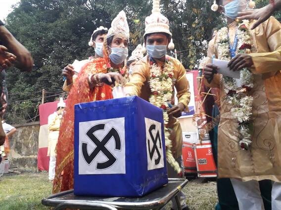 পার্থপ্রতিম ঘোষ, কলকাতা: বিধানসভা ভোটের দিনক্ষণ এখনও ঘোষণা করেনি নির্বাচন কমিশন। তার আগেই বিপুল ভোটে জয়ী হল তৃণমূল কংগ্রেস! বিধানসভা ভোটের আগে এক অভিনব ভোট হল টালাতে। কলকাতা পুরসভার ৪ নম্বর ওয়ার্ডের কো-অর্ডিনেটরের উদ্যোগে টালা পার্কের ইন্দিরা ময়দানে এক গণবিবাহের আয়োজন করা হয় রবিবার। সেখানে দক্ষিণ ২৪ পরগনা, উত্তর ২৪ পরগনা, নদীয়া, হাওড়া, বীরভূম থেকে পাত্র-পাত্রীদের নিয়ে এসে গণবিবাহ সম্পন্ন করা হয়। সেই বিয়ের আগেই ব্যালট পেপারে ভোট দিলেন নবদম্পতিরা। ৭০ জন দম্পতি ভোটাধিকার প্রয়োগ করলেন। প্রতীকী ব্যালটবক্সে নিজেদের মতামত দিলেন। ঘোষণা হল ভোটের ফলাফলও।