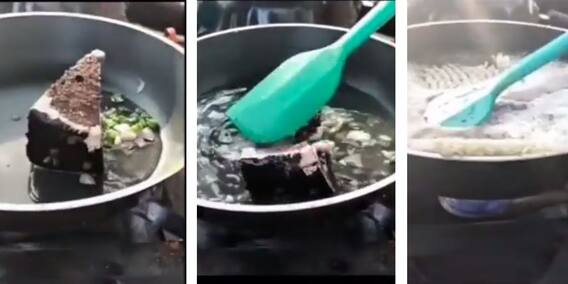 কড়ায় গরম জলে পেঁয়াজ কুচি, লঙ্কা দেওয়ার পর এক টুকরো চকোলেট পেস্ট্রি দিয়ে ভাল করে খুন্তি দিয়ে স্ম্যাশ করে দেওয়া হল। এরপর সেটা যেই ফুটতে শুরু করল, ওমনি তাতে ম্যাগি দেওয়া হল। এরপর ম্যাগি প্যাকেটে থাকা মশলাও দেওয়া হল।