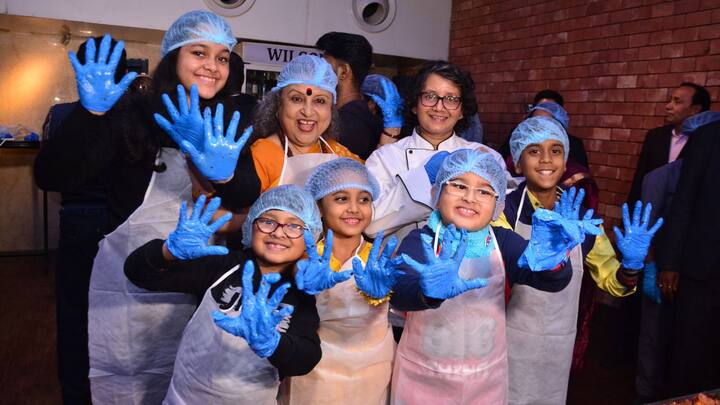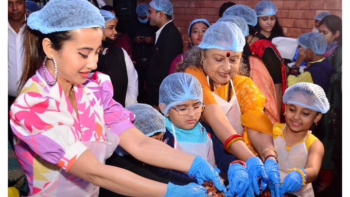 Actress Monami Ghosh: রঙিন পোশাকে শুকনো ফল ও কেকের অন্যান্য উপকরণ মেশান খুদেরা। সবার সঙ্গে কেক মেশানোয় হাত লাগিয়ে খুশি মনামীও।