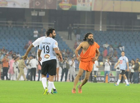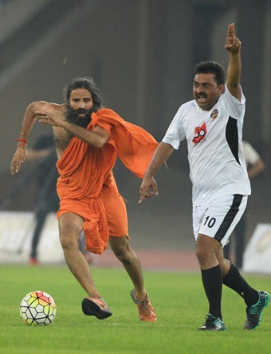 ওই ইভেন্টের ব্র্যান্ড অ্যামবাসাডর রামদেব। খেলোয়াড়দের সঙ্গে বেশ সক্রিয়ভাবে ফুটবল খেলতে দেখা যায় তাঁকে। (ছবি-এএফপি)