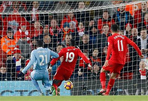 Stoke City's Giannelli Imbula, left, scores an own goal during the English Premier League soccer match between Liverpool and Stoke City, at Anfield, in Liverpool, England, Tuesday Dec. 27, 2016. (Martin Rickett/PA via AP)