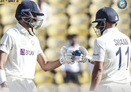 গতকাল জাডেজা ও অক্ষর পটেল ক্রিজে ছিলেন। ২ জনেই অর্ধশতরান করেছিলেন। এদিন সকালে প্রথমে মার্ফির বলে বোল্ড হয়ে যান জাডেজা। ৭০ রান করে প্যাভিলিয়নে ফেরেন তিনি। জাডেজা ফিরলেও অক্ষর পটেলকে ফেরাতে কালঘাম ছুটে যায় অজি বোলারদের। ভারতীয় অলরাউন্ডারের সঙ্গে যোগ দেন মহম্মদ শামিও। একপ্রকার ওয়ান ডে-র ধাঁচে খেলে ৩৭ রান করেন তারকা পেসার। টেস্টে ২৩টি ছক্কা হাঁকান শামি। শামি ফিরে যাওয়ার পর সিরাজকে নিয়ে চারশোর গণ্ডি ছুঁয়ে নেন অক্ষর পটেল। প্রথম ইনিংসে ২২৩ রানের লিড নিয়ে নেয় ভারত। অক্ষর তাঁর ৮৪ রানের ইনিংসে ১০টি বাউন্ডারি ও ১টি ছক্কা হাঁকান।