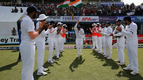প্রথম দিনে ব্যাট করতে নামার সময় মোহালির দর্শকরা ‘কোহলি কোহলি’ জয়ধ্বনিতে মাঠ মুখরিত করে তুলেছিল। ম্যাচের আগে কোচ রাহুল দ্রাবিড়ের হাত দিয়ে বিশেষ স্মারকও দেওয়া হয়েছিল কোহলিকে। এবার দ্বিতীয় দিনে ভারতীয় দল বোলিং করতে নামলে কোহলিকে ‘গার্ড অফ অনার’ দিয়ে মাঠে স্বাগত জানালেন রোহিত শর্মা-সহ গোটা ভারতীয় দল। কোহলি আগে মাঠে নেমে গেলেও অধিনায়ক রোহিত তাঁকে ‘গার্ড অফ অনার’ দেবেন বলেই আবার মাঠে ঢুকতে অনুরোধ করেন।