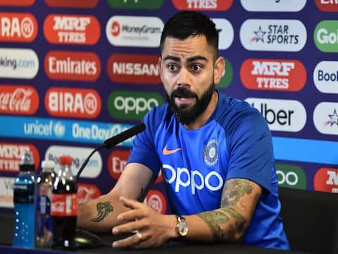 BIRMINGHAM, ENGLAND - JUNE 29: Virat Kohli of India talks to the press at Edgbaston on June 29, 2019 in Birmingham, England. (Photo by Nathan Stirk/Getty Images)