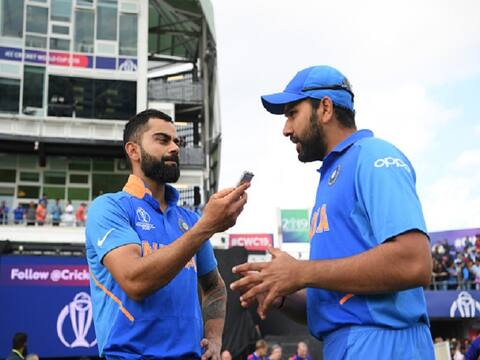 LEEDS, ENGLAND - JULY 06: Virat Kohli of India interviews Rohit Sharma of India at the end of the match during the Group Stage match of the ICC Cricket World Cup 2019 between Sri Lanka and India at Headingley on July 06, 2019 in Leeds, England. (Photo by Stu Forster-IDI/IDI via Getty Images)