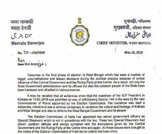 শেষ দফার ভোটের আগে তুঙ্গে সংঘাত। এবার সরাসরি মুখ্য নির্বাচন কমিশনারকে চিঠি লিখলেন মমতা বন্দ্যোপাধ্যায়। পক্ষপাতমূলক আচরণের অভিযোগ। অমিত শাহর রোড শোয়ের অনুমতি দেওয়ায় পুলিশ কমিশনারের ভূমিকা নিয়েও প্রশ্ন।
