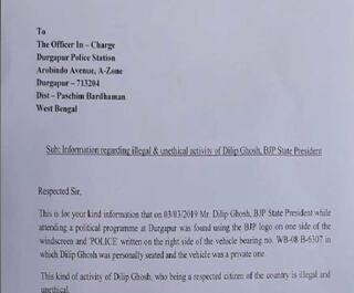 পুলিশের স্টিকার লাগানো গাড়ি ব্যবহারের অভিযোগে বিজেপি রাজ্য সভাপতি দিলীপ ঘোষের বিরুদ্ধে দুর্গাপুর থানায় অভিযোগ তৃণমূলের