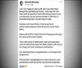 পরপর তিনবার একশ দিনের কাজে প্রথম পশ্চিমবঙ্গ, সোশ্যাল মিডিয়ায় এই বার্তা জানিয়ে রাজ্যবাসীকে অভিনন্দন মুখ্যমন্ত্রীর