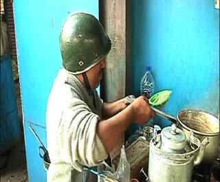 সাধারণ ধর্মঘট: হাজরায় হেলমেট পরে চা বিক্রি