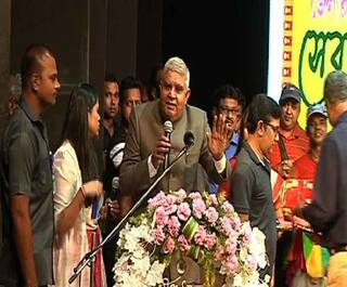 রবীন্দ্র সদনের অনুষ্ঠানে মঞ্চে রাজ্যপাল। অডিটোরিয়াম থেকে হঠাৎ উঠল জয় বাংলা স্লোগান। পাল্টা জবাব রাজ্যপালের।